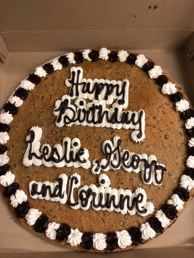 Sometimes working as a morning news producer can be the pits! I mean the hours stink and the pay is so-so. One of the only things that cheers you up some days are your fantastic co-workers. My birthday isn’t until May 19th, but my co-workers decided to celebrate all the May birthdays today. Sometimes it just takes a smile and a little cookie cake to get through the day. My co-workers are the BEST!